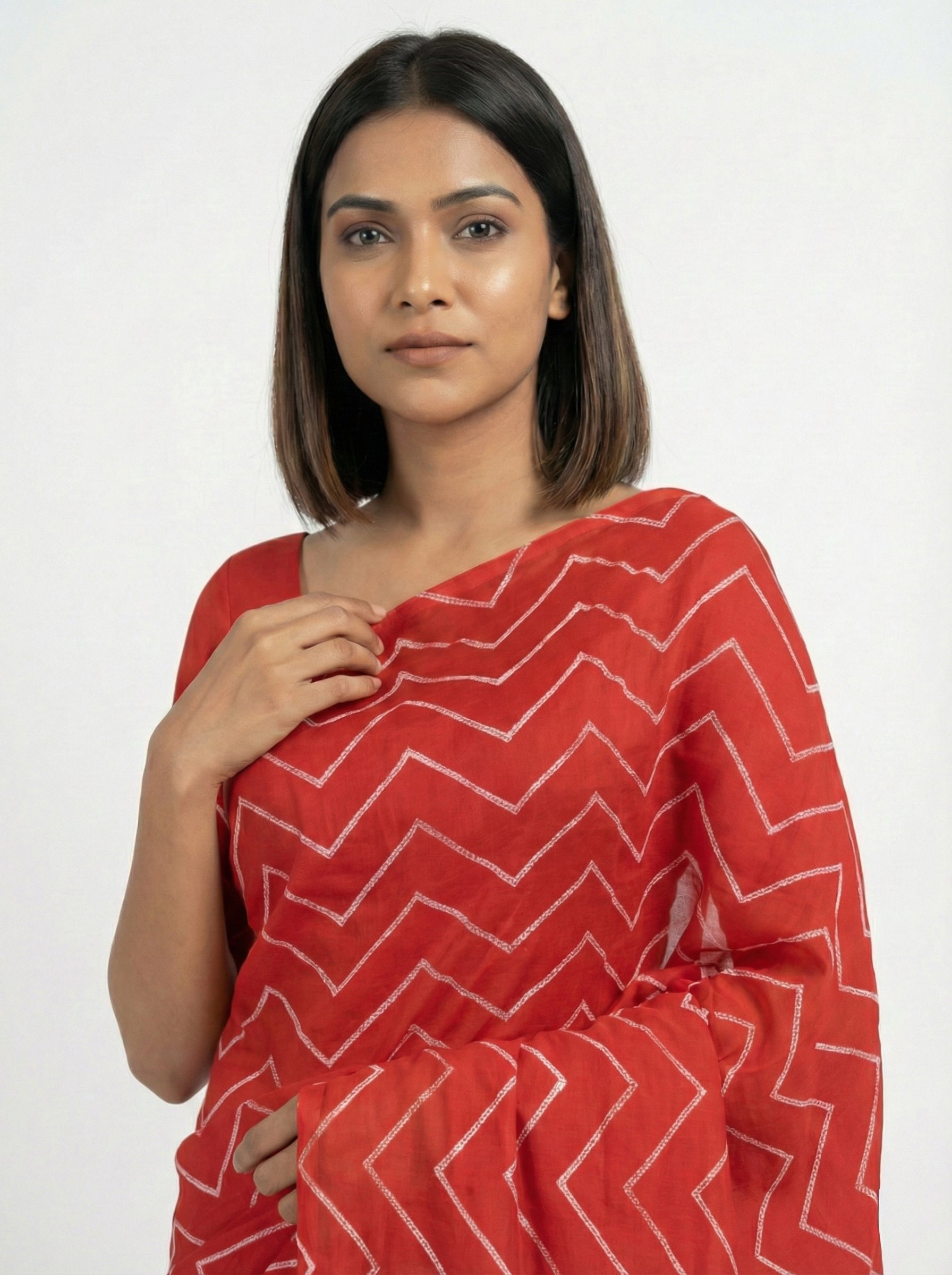• Chiffon Classic Red Saree with Statement Zig Zag Design